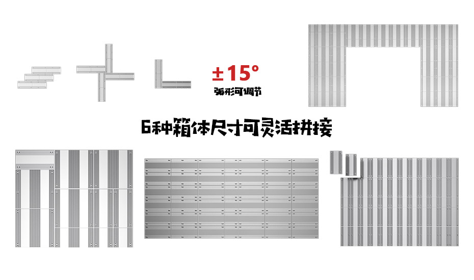 灵活创意拼接 支持±15°弧形调节,六种箱体尺寸可自由横竖拼接,满足多种场景创意布局。
